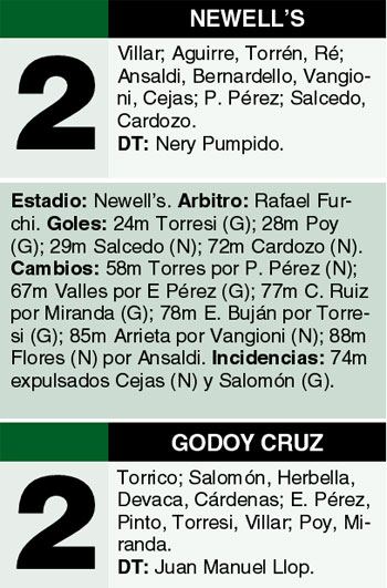 Newell’s continúa con su racha sin poder ganar, ya que acumula diez jornadas sin victorias, pero al menos rescató un punto al igualar 2-2 ante Godoy Cruz, que se imponía 2-0 y no supo sostener el marcador. Mariano Torresi, de tiro libre, puso en ventaja a los mendocinos, que aumentaron su diferencia a través Mauro Poy, hijo de Aldo y ex jugador de Central. Newell’s lucía desconcertado, pero llegó rápido al descuento a través del paraguayo Santiago Salcedo. Ya en la segunda etapa, Oscar Cardozo señaló la igualdad definitiva, que dejó a Nery Pumpido con muchas complicaciones para seguir en su cargo, teniendo en cuenta la floja campaña del equipo, que está 17º, con 16 puntos.