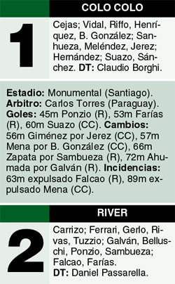 River inició su camino en la Copa Libertadores con mucha autoridad y exhibiendo un juego sólido venció 2-1 a Colo Colo de Chile, por el Grupo 6 del torneo continental. El equipo de Passarella pudo haber ganado por una mayor diferencia, debido a que tuvo muchas posibilidades para convertir.