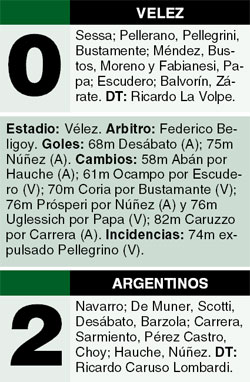 Pasado el rato de sofocón, Argentinos pudo recuperar metros en el campo y emparejar el trámite. Y en eso estaba cuando encontró el gol. Vino el corner de la derecha, dudó Sessa y por el segundo palo apareció Desábato para conectar de cabeza y dejar al arquero a contrapierna. El tanto terminó de desacomodar a Vélez, que se desordenó por completo. Para colmo, los cambios de La Volpe tampoco ayudaron, al dejar al equipo con cuatro delanteros y dos defensores, que un rato después fue sólo uno por la expulsión de Pellegrino. Y antes de que el técnico pudiera rearmar a sus jugadores, Argentinos lo liquidó con un contragolpe que encabezó Abán y que definió de manera perfecta Núñez con un derechazo cruzado a la carrera.
