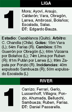 River logró un valioso empate en la altura de Quito, al igualar 1-1 con la Liga Deportiva, por la Copa Libertadores, y recuperarse de la caída ante Caracas en Buenos Aires. Ernesto Farías marcó la igualdad en la segunda etapa, cuando el equipo de Passarella caía por un tanto de Vera. En la primera etapa, Rubens Sambueza recibió una nueva tarjeta roja, mientras que Escalada fue expulsado en el local.