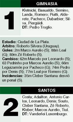 Gimnasia cayó como local 2-1 ante Santos y comprometió sus chances de clasificarse a los octavos de final de la Copa Libertadores. Es que con este traspié, el conjunto dirigido por Pedro Troglio quedó tercero en el Grupo 8, con 3 puntos, por debajo de Santos (12) y Defensor Sporting (6) y delante de Deportivo Pasto, sin unidades. El equipo brasileño tardó apenas dos minutos en ponerse en ventaja: Tiuí envió un centro y Marco Aurelio, sin marca, empujó la pelota. Incluso, pudo haber estirado la diferencia, pero el penal ejecutado por Claver Santana chocó contra el palo. El local presionó y llegó al empate con un gol de cabeza de Leal. Pero una desconcentración en el fondo le permitió a Zé Roberto, con un potente zurdazo, marcar el gol del triunfo.
