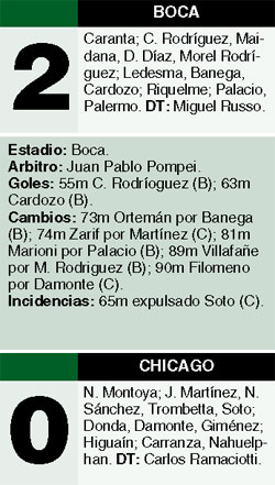 Fueron dos, pero pudieron haber sido tres o cuatro. Incluso, si Boca hubiera completado una goleada, pocos se habrían animado a hablar de una sorpresa. Es que, una vez más, el equipo de Miguel Russo volvió a desplegar un buen rendimiento colectivo, con actuaciones individuales muy altas, y se llevó una victoria que le permite, al menos hasta hoy, compartir la punta junto a San Lorenzo. Poco pudo hacer Chicago, que terminó con un hombre menos por la expulsión de Soto y pagó caro su planteo excesivamente defensivo. Clemente Rodríguez y Cardozo, ambos en el segundo tiempo, fueron los encargados de marcar los goles para el triunfo de Boca.