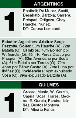 Argentinos apenas empató como local 1-1 ante Quilmes, en La Paternal, y desaprovechó una buena oportunidad para descontarle puntos al líder San Lorenzo. El equipo de Caruso Lombardi mereció el triunfo, pero no logró liquidar el partido y Quilmes, con un jugador menos, llegó a la igualdad. Hauche, en la primera mitad, y Batalla, en el complemento, anotaron los goles del partido. Los dos equipos terminaron con diez jugadores por las expulsiones de Sosa y Barzola. Con esta igualdad, Argentinos quedó en una posición expectante, mientras que el conjunto de Alberto Fanesi continúa en zona de descenso directo.