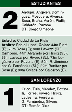 El campeón mostró su chapa. En un partido clave, Estudiantes demostró su jerarquía y le dio un duro cachetazo a San Lorenzo, que cayó 2-1 en La Plata, dejó el invicto y hoy puede perder la exclusividad de la punta si gana Boca. Pablo Piatti y José Sosa marcaron los goles del equipo de Simeone, que justificó el triunfo en la segunda etapa. Cuando no había tiempo, Ezequiel Lavezzi descontó con un golazo.