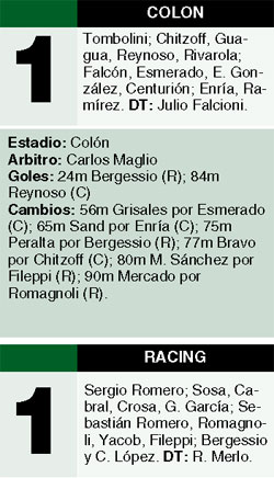 Sin demasiadas situaciones de gol, la clave del juego pasaba por la efectividad frente al arco rival. Y allí acertó Racing, que no desaprovechó una de las pocas chances que generó. Un error compartido entre Tombolini y Guagua derivó en un corner innecesario. Y de ese tiro de esquina llegó la apertura, cuando Bergessio encontró un rebote en el área y sacó una media vuelta de zurda que se clavó en el ángulo de Tombolini. En desventaja, la levantada de Colón apareció, aunque no de manera arrolladora. Racing ya se paró unos metros más atrás y se afirmó en la seguridad de Sergio Romero. Precisamente, el arquero de la Selección Argentina Sub-20 evitó la igualdad en la ocasión más clara de los locales, cuando le sacó del ángulo una media vuelta a Falcón.