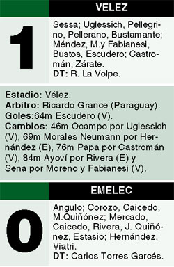 Vélez logró ayer la clasificación a los octavos de final de la Copa Libertadores, tras vencer como local a Emelec, de Ecuador, por 1-0, con un golazo de Damián Escudero, y se convirtió en el primer equipo del fútbol argentino en alcanzar esa instancia en el torneo, tras las eliminaciones de River y Banfield.