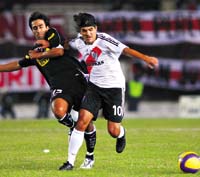 River, que volvió a contar desde el comienzo con Ariel Ortega, manejó con criterio la pelota con algunos chispazos del delantero jujeño, aunque no generó situaciones de riesgo en la misma proporción. Colo Colo exhibió una pobreza futbolística acaso vinculada con las cinco bajas que sufrió el conjunto de Claudio Borghi para este partido. Recién sobre la media hora, los chilenos equilibraron el juego en la mitad de la cancha por el trabajo de Sanhueza, aunque como su rival, sin crear situaciones claras de gol. A los 39, el árbitro Oliveira debió haber expulsado a Galván por cometerle una fuerte infracción a Villarroel, pero sólo lo amonestó.