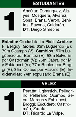 Estudiantes no pudo alcanzar la punta del Clausura, pese a que había hecho méritos para ganarle a Vélez y lo derrotaba con un tanto de Pablo Lugüercio. Sin embargo, Vélez creció a partir de la expulsión de Braña y llegó al empate con un golazo de Ocampo.