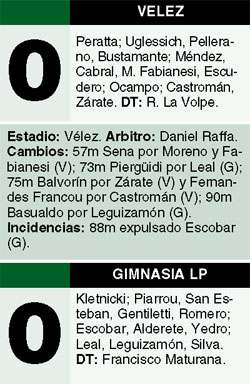 Vélez tenía que ganar para mantener sus esperanzas de clasificarse para la Copa Sudamericana. Sin embargo, con una actitud indolente, el equipo de Ricardo La Volpe apenas igualó 0-0 ante Gimnasia, un resultado que lo deja con muy pocas chances de conseguir su objetivo. Para Gimnasia, que terminó con diez hombres por la expulsión de Matías Escobar, al menos quedó el consuelo de sumar su segundo empate consecutivo, tras cuatro derrotas seguidas, en el arranque del ciclo de Francisco Maturana.