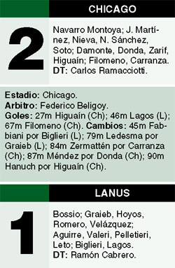 El partido fue intenso y atractivo, con chances para los dos equipos. Sin embargo, Chicago aprovechó mejor sus buenos momentos y por eso se llevó el triunfo. En el primer tiempo se puso en ventaja con una media vuelta de Higuaín, que antes se había llevado el balón con la mano. Lanús sintió ese impacto y recién reaccionó en el arranque del segundo tiempo, cuando llegó a la igualdad con un buena maniobra colectiva, perfectamente definida por Lagos con un cabezazo bombeado. Con los dos equipos buscando la victoria, el que primero acertó fue Chicago, cuando Filomeno se fue por la derecha, enganchó hacia adentro, dejó dos hombres de encima y sacó un remate que no parecía demasiado peligroso, pero que a Bossio se le escurrió de las manos. Así Chicago festejó un triunfo que trajo yapa.