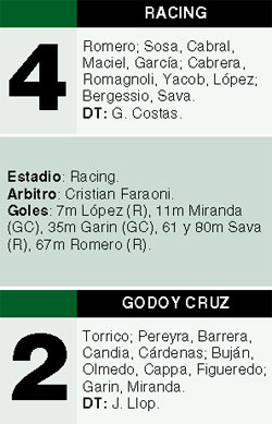 Racing terminó el certamen con un triunfo por 4-2 ante Godoy Cruz, y ahora esperará la próxima temporada con un poco más de optimismo. Si bien comenzó en desventaja, el equipo local encontró los caminos para revertir el resultado, y el delantero Sava fue uno de los más destacados del ganador. El ex Ferro marcó dos goles, y los otros fueron convertidos por López y Romero. Para los mendocinos marcaron Miranda y Garin. Godoy Cruz deberá jugar esta semana la Promoción ante Huracán o Tigre, con la intención de mantener su lugar en Primera división. El miércoles jugará de visitante, y domingo próximo definirá la serie en Mendoza.
