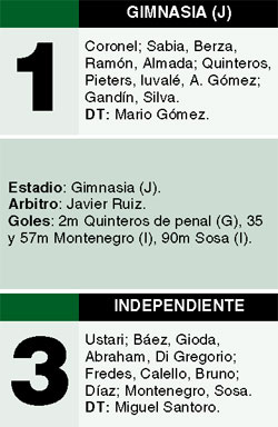 Independiente despidió el ciclo de Miguel Santoro de manera invicta, debido a que anoche venció 3-1 a Gimansia, en Jujuy, en la última fecha del torneo Clausura. El conjunto de Avellaneda pudo revertir el resultado a partir del rendimiento de Daniel Montenegro, que precisamente convirtió dos goles para su equipo. El otro lo hizo Ismael Sosa. Quinteros, de penal, había puesto en ventaja a los locales. Independiente comenzará la próxima temporada bajo la conducción de Pedro Troglio, que ya destacó que iniciará su trabajo con la idea de obtener el título. Por su parte, los jujeños seguirán en la búsqueda de más puntos para tratar de por lo menos salir del fondo de la tabla de los promedios.