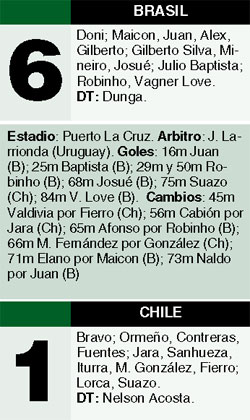 Con una superioridad asombrosa, Brasil se clasificó para las semifinales de la Copa América al vencer 6-1 a un apático equipo chileno, que se entregó casi antes de jugar y que ya perdía 3-0 antes de la media hora de juego. Juan, Julio Baptista, Robinho, en dos ocasiones, Josué y Vagner Love marcaron los goles del conjunto de Dunga, que ahora se enfrentará a Uruguay. Suazo descontó con un golazo.