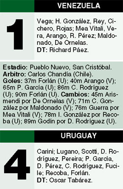 Uruguay le ganó 4-1 a Venezuela y pasó a la semifinal de la Copa América. El equipo de Tabárez borró la pálida imagen mostrada en la fase inicial y se impuso con los tantos de Diego Forlán –dos veces–, Pablo García y Cristian Rodríguez. Juan Arango empató transitoriamente para los locales.