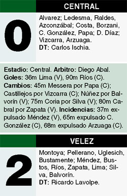 En un partido caliente y emotivo hasta el final, Vélez le ganó 2-0 a Central, en Rosario. Lima, con un golazo de tiro libre, abrió la cuenta en el primer tiempo y Ríos en el final, cuando los rosarinos buscaban el empate con nueve hombres, liquidó el partido.