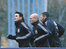Bajo una fuerte lluvia y un molesto viento helado, Batista dirigió su primera práctica previa al partido con España. El grueso de los jugadores convocados realizó fútbol en espacios reducidos junto a un combinado de juveniles, mientras que los cuatro futbolistas del Inter italiano, Walter Samuel, Javier Zanetti, Esteban Cambiasso y Diego Milito, trotaron alrededor del campo. Hoy habrá doble turno, con un primer ensayo desde las 10, y una segunda práctica por la tarde, a las 16.