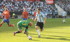 Messi parece sentirse más cómodo en este esquema diseñado por Sergio Batista. La estrella del Barcelona se mueve con otra soltura, mucho más cerca del área rival, y suele comenzar sus acciones sobre el sector derecho, de la misma manera que lo hace en Barcelona. Una de sus habituales acciones la empezó en esa posición, y luego de dejar a cuatro rivales en el camino, habilitó a Di María, pero éste convirtió en posición adelantada. Sin duda fue la jugada más impactante de Messi.