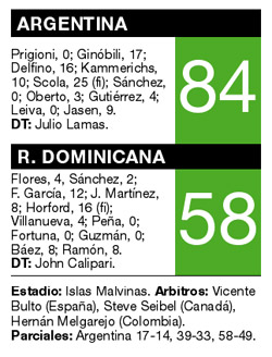 “Fue una noche de aprendizaje”, sentenció Carlos Delfino a la derrota ante Brasil. “Los jugadores reaccionaron como yo quiero que lo hagan después de un partido perdido”, agregó Julio Lamas. Y así lo demostraron. La lesión de Nocioni obligó al DT a cambiar la estructura. Con Oberto entre algodones, el que se benefició fue Kammerichs, quien aprovechó de la mejor manera la oportunidad en esos primeros minutos. En ataque sumó cuatro puntos y en defensa controló al temible Horford, tomó cuatro rebotes y colocó dos tapones que levantaron al estadio. Con su inesperado protagonismo, Argentina tomó una pequeña luz de ventaja, aunque la mano de Francisco García desde lejos mantenía a los caribeños siempre cerca. “Horford es una de las figuras del torneo y era necesario anularlo. Sabía que era fundamental hacer ese trabajo y me preparé sólo para que no pudiera tocar la pelota”, resaltó el inesperado héroe de la noche. “Lo de Kammerichs fue impecable”, elogió Ginóbili. “No sólo aportó rebotes y tapas. Anular a Horford, que es un All Star, no es sencillo y lo hizo perfecto”, agregó el bahiense. Más allá del buen trabajo del correntino, el equipo de Lamas aparecía otra vez trabado en ofensiva, aunque la intensidad en defensa le daba suficientes réditos como para mantener la diferencia. Además, la entrada de Jasen, otro que tuvo más minutos por la ausencia de Nocioni, también resultó positiva porque se prendió con acierto en la lucha de los rebotes en los dos tableros. “Ganamos claramente. La defensa interior fue muy buena y neutralizamos un ataque picante, con muchas penetraciones”, indicó Lamas.