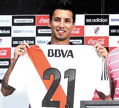 Luego de su primera práctica en River, el mediocampista Leonel Vangioni (foto) fue presentado como nuevo jugador de la institución. Acompañado por el vicepresidente Diego Turnes, firmó el contrato que lo une a la entidad de Núñez hasta diciembre de 2015 y se convirtió, oficialmente, en el primer refuerzo del equipo de Ramón Díaz. “Jugar en River es algo que siempre soñé. Ojalá sea con mucho éxito porque cada vez que me ponga la camiseta lo voy a disfrutar al máximo”, aseguró, entusiasmado, el ex Newell’s. El zurdo mediocampista, que fue uno de los jugadores requeridos por el entrenador para encarar su tercer ciclo al frente del club, admitió que lo puso “muy feliz” saber que Ramón tenía deseos de contratarlo. “Que te pida un técnico de esa jerarquía es algo que pone bien a cualquiera”, enfatizó. A su vez adelantó que tiene capacidad para jugar como lateral o como mediocampista por la banda izquierda, situación que, ante la falta de jugadores con ese perfil en el plantel, asoma como una interesante alternativa para el equipo. “Puedo jugar en cualquiera de los dos puestos, estoy a disposición para lo que el técnico necesite”, subrayó. El oriundo de Villa Constitución reveló que para él “es un orgullo” poder formar parte del plantel de River, y también destacó la velocidad con la que se concretó su pase. “Yo esperaba que se cierre lo más rápido posible, y se llegó a un acuerdo en tres reuniones. Por suerte ahora sólo resta pensar en el torneo que viene”, concluyó.