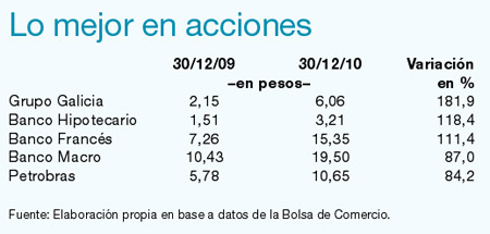 En el ranking de las acciones que componen el MerVal, las mayores subas estuvieron vinculadas con la actividad bancaria. El Grupo Galicia lideró el panel con un avance de 181,9 por ciento, seguido por el Banco Hipotecario (118,4) y el BBVA Francés (111,4 por ciento). Considerando las principales 25 compañías, Boldt lideró el año con 210,2 por ciento. También mostraron muy buenos desempeños Molinos (155,9 por ciento) y Transportadora de Gas del Sur (112,41 por ciento).