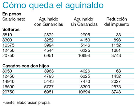 Así, el monto del impuesto que dejan de pagar los casados con dos hijos va de 63 pesos para los salarios que están en el borde del mínimo no imponible hasta a 3743 pesos cuando los ingresos brutos llegan a 25.000 pesos mensuales. Para los solteros el beneficio oscila entre 33 y 3743 pesos (ver cuadros). La excepción para el grueso de los trabajadores alcanzados por Ganancias implica que solamente pagarán el impuesto sobre la segunda cuota del SAC 172 mil trabajadores. Se trata de los trabajadores que tienen salarios brutos superiores a los 25 mil pesos mensuales.