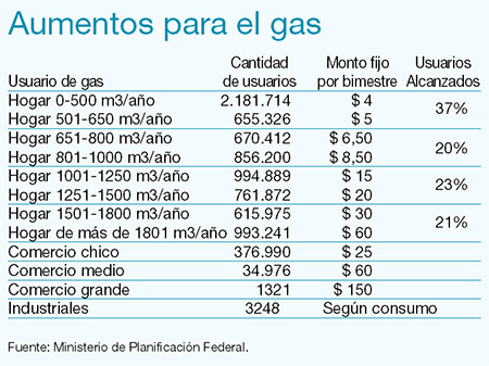 El Gobierno anunció ayer un incremento en las boletas de gas para todo el país y de luz para los hogares de Capital Federal y Gran Buenos Aires. Los clientes domiciliarios deberán abonar un monto adicional por bimestre que varía, según rangos de consumo, de 4 a 150 pesos para la electricidad y de 4 a 60 pesos para el gas. Para los comercios el ajuste va de 45 a 300 pesos para la luz y de 25 a 150 pesos para el gas, mientras que para los industriales dependerá del consumo puntual de cada empresa, aunque no se dieron precisiones. Este ajuste permitirá recaudar 2000 millones de pesos por año. El ministro de Planificación, Julio De Vido, aseguró que el dinero irá a dos fideicomisos administrados por el Banco Nación que financiarán obras de infraestructura definidas por el Gobierno, junto a gobernadores e intendentes, y ejecutadas por los concesionarios privados.