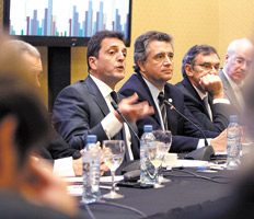 Del encuentro participaron aproximadamente 45 cámaras empresarias. Massa estuvo acompañado por su equipo de economistas y diputados de esa área, como José Ignacio De Mendiguren, Daniel Arroyo, Miguel Peirano, Ricardo Delgado, Martín Redrado, entre otros. “¿Martín, vas a querer decir algo?”, le preguntaron a Redrado desde la organización. “Sí, sí, por qué no”, respondió el ex titular del Banco Central, mientras enfilaba hacia la salida del Hotel Meliá. El Foro de Convergencia Empresarial ya estuvo reunido con Hermes Binner, Julio Cobos, Ernesto Sanz y Mauricio Macri.