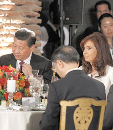 Luego de la firma de acuerdos y la conferencia de prensa conjunta, la presidenta Cristina Fernández de Kirchner agasajó a su par chino, Xi Jinping, con una cena de honor en el Museo del Bicentenario, ubicado en la ex Aduana, detrás de la Casa Rosada. Durante el brindis, la mandataria afirmó que la “relación estratégica” entre ambos países alcanzó ayer un nivel “integral”, lo que “abre oportunidades de negocios” para empresarios de ambas partes.