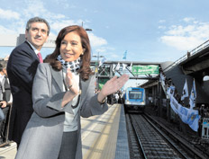 La presidenta Cristina Fernández de Kirchner presentó ayer siete formaciones cero kilómetro que se incorporarán al servicio del ramal Sarmiento. Los trenes de nueve coches cada uno incrementarán la capacidad de transporte de 240 a 400 mil individuos por día, un aumento del 67 por ciento. A su vez, la frecuencia de la línea pasó a ser de un tren cada 10 minutos, cuando era de 15 minutos, mientras que la duración del recorrido de Once a Moreno retrocedió de 75 a 40 minutos. El proceso de renovación del material ferroviario del Sarmiento contempla incorporar otras 18 formaciones importadas de China para mediados de septiembre. “Tendremos un transporte ferroviario a la altura de los tiempos y a la altura de lo que se merecen todos los argentinos”, afirmó la Presidenta.