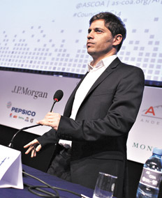 El eje del discurso de Kicillof, orador del panel de cierre, fue el contexto económico mundial, a partir del cual vaticinó un escenario estrecho para los países emergentes los próximos años. Citó al economista inglés John Maynard Keynes, habló de la política económica de la dictadura y explicó cómo el deterioro de la balanza comercial energética impactó en forma negativa sobre la disponibilidad de divisas y el déficit fiscal. Se esforzó en sostener en clave didáctica un discurso que escucharon empresarios de primera talla como Eduardo Eurnekian (Corporación América), Cristiano Ratta-zzi (FIAT), Daniel Funes de Rioja (Copal), Alejandro Bulgheroni (Bridas), José Ignacio de Mendiguren y José Urtubey (UIA), Adelmo Gabbi (Bolsa de Comercio), Carlos De la Vega (Cámara de Comercio), Gustavo Weiss (Cámara de la Construcción), Daniel Pelegrina (Sociedad Rural) y Darío Pérez Santisteban (Cámara de Importadores). Héctor Méndez, titular de la UIA, en cambio, prefirió permanecer en un salón contiguo.