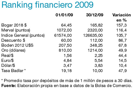 El mercado financiero dio revancha luego del desplome de 2008. Los activos que cotizan en la plaza local reportaron ganancias que permitieron hasta duplicar el capital invertido en el transcurso del año. Los papeles bancarios y los títulos públicos fueron la mejor alternativa. La decisión de reabrir el canje de deuda se convirtió en el principal motor del excelente desempeño de la Bolsa de Comercio, que se ubicó quinto entre las que más ganaron a nivel mundial, con un alza en dólares del 89,6 por ciento, de acuerdo con un informe del Instituto Argentino de Mercado de Capitales. El dólar al público cerró en 3,83 pesos, con una apreciación de apenas el 10,4 por ciento.