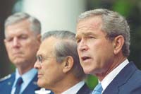 Los servicios de protocolo de la Casa Blanca montaron el atril del presidente estadounidense en el Rose Garden, un lugar que, en nivel de solemnidad, está sólo un escalón por debajo del Despacho Oval. El presidente escogió a tres personas para acompañarlo en un discurso impuesto claramente como primera ceremonia de explotación política de los acontecimientos de anteayer. Estaban junto a él, con gesto circunspecto pero satisfecho, el secretario de Defensa, Donald Rumsfeld; la autoridad civil de Estados Unidos en Irak, Paul Bremer, y el presidente de la Junta de Estado Mayor, Richard Myers. Según Bush, la muerte de los hijos de Saddam representa “el final de dos de los mayores secuaces del régimen”. “Los hijos de Saddam Hussein eran responsables de torturas, suplicios y asesinatos de innumerables iraquíes. Ahora, más que nunca, los ciudadanos de Irak pueden estar seguros de que el antiguo régimen ha desaparecido y no va a volver”, dijo el presidente.