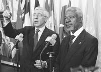 Después de entrevistarse con el ministro de Exteriores británico Jack Straw en la ONU en Nueva York, Annan reiteró su negativa al envío de los cascos azules a Irak expresando que “no tenemos capacidad”. Straw, por su parte, señaló que las discusiones de ayer a nivel privado con los países del Consejo de Seguridad fueron “constructivas”. “Queremos obtener consenso. Y sabemos que tal como ocurrió con otras resoluciones de la ONU sobre Irak a partir de la 1441 del último otoño, eso es posible”, señaló.