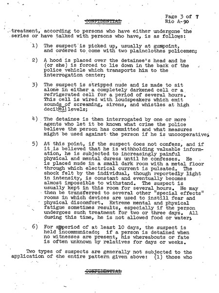 Según el documento, para los estudiantes las torturas empezaban en el mismo momento en que los detenidos eran secuestrados a punta de pistola por policías civiles en vehículos sin chapa. Apenas los subían al auto, los encapuchaban y los obligaban a acostarse en el piso del asiento trasero. Al llegar a la comisaría lo desnudaban y lo dejaban varias horas en una celda fría y oscura, con parlantes enchufados que emitían gritos, sirenas y silbidos a altos decibeles. Después venía la rutina policía bueno-policía malo y después, si el prisionero no confesaba, la tortura continuaba: