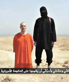 Luego la imagen muestra a Foley, arrodillado sobre la arena con un desierto de fondo y vestido con una túnica color rojo anaranjado. Tras las palabras pronunciadas por el rehén, un verdugo encapuchado y vestido todo de negro comienza a decapitarlo a degüello con un cuchillo.