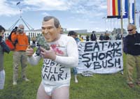 Habib, en el Parlamento, como invitado de los Verdes, también fue echado, después de gritar: “Oiga Bush, ¿qué pasa con mi padre?”. Pero considerando todo esto, Bush la sacó barata. Sólo unos 2000 manifestantes se hicieron presentes y se los mantuvo a unos 100 metros, prácticamente fuera del alcance del oído. Se les dio permiso de usar micrófonos, pero sólo si apuntaban los parlantes hacia afuera del edificio. Adentro, la mayoría del público escuchaba atentamente y aplaudía en los momentos precisos, aun parlamentarios de la oposición que habían amenazado con darle la espalda al presidente.