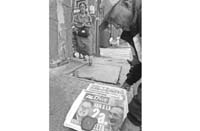 Una mujer guatemalteca pasa junto a un puesto de diarios.