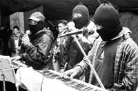 La marimba y la batería vienen esta noche reforzadas por trompeta y saxofón, fusionando el son tzotzil tradicional, la música de banda de pueblo, la cumbia y una suerte de primitivo jazz. Los danzantes, muy jóvenes en su mayoría, procedentes de Estados Unidos, el País Vasco y otras partes del Estado español, Italia, Alemania y diversas ciudades dela República Mexicana, están muy contentos. Forman culebras que intentan girar en caracol bailando. Los punks de Oaxaca y el Distrito Federal, refulgentes a rabiar de estoperoles y cabelleras color malva, bailan un slam extrañamente sosegado.