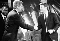 En el debate del domingo, Edwards trató de aplacar los comentarios de que buscaba ser el compañero de fórmula del senador Kerry. Las recientes encuestas mostraron que la fórmula Kerry-Edwards podría derrotar fácilmente al equipo Bush-Cheney. Cuando se le preguntó por esto, respondió rápidamente: “Oh no. Lejos de eso”. Parecía ansioso por resaltar su opinión al hacer observaciones inusualmente duras hacia el favorito, sosteniendo que el senador Kerry había votado malos acuerdos comerciales para los estadounidenses y que sus propuestas sobre temas que iban desde la salud a la educación “nos llevarán más y más profundamente al déficit”. Al devolver el fuego, Kerry, un veterano con 19 años de Washington, destacó la relativa inexperiencia de su rival, que sólo cumplió un término en el Senado de Estados Unidos. Lo que Estados Unidos necesitaba, dijo, era alguien con “probada habilidad para pararse y soportar las peleas duras”.