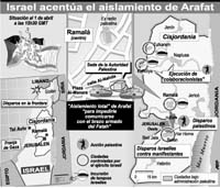 Mientras el ejército israelí acentúa el sitio de ciudades en Cisjordania, en Ramalá Arafat sigue cercado y las tropas israelíes intentan desarmar a los policías que encuentra a su paso. Estados Unidos presionó sobre Arafat pero pidió a Israel que modere su ofensiva.
