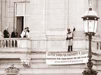 Desde el balcón, agentes de policía trataron de convencer al activista para que se entregase, pero el intruso hizo caso omiso y se dedicó a saludar, con ademán algo cómico de echar a volar, a la curiosa multitud congregada frente a la puerta del palacio. Tras casi cinco horas de negociaciones y tensa espera, la policía metropolitana de Londres logró retirar a última hora de la tarde al activista, que fue bajado con la ayuda de una grúa con cesta e introducido en un furgón policial.
