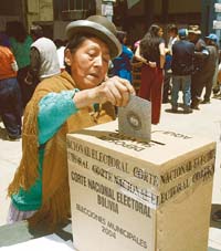 Cerca de 4,5 millones de bolivianos fueron convocados para elegir a los alcaldes de 327 municipios, en una jornada en la que al menos 62 pueblos indígenas podían elegir ayer por primera vez a sus autoridades oficiales entre postulantes de sus propias organizaciones políticas, en el marco de la octava elección municipal desde que fue restaurada la democracia boliviana en 1982. El presidente de la Corte Nacional Electoral (CNE), Oscar Hassenteuffel, destacó la presencia de “elementos nuevos y enriquecedores” –el plazo para dar cuenta de los resultados es fin de mes–. Por otro lado, el líder cocalero Evo Morales, cuyo partido Movimiento Al Socialismo (MAS) saldría fortalecido en todo el país,denunció la posibilidad de un golpe de Estado. Los rumores fueron descalificados por el gobierno.