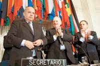 Insulza y Derbez empataron cinco veces consecutivas con 17 votos cada uno en la elección celebrada el 11 de abril pasado, que fracasó en elegir un secretario general. El cargo está vacante desde el 15 de octubre, cuando el ex presidente costarricense Miguel Angel Rodríguez renunció al cargo menos de un mes después de asumirlo para enfrentar acusaciones de corrupción en su país.
