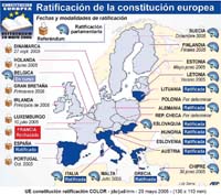 Dinamarca será el cuarto país de la UE en celebrar referéndum, el próximo 27 de septiembre de 2005, y los sondeos hoy dan por seguro el “sí”. El primer ministro, Anders Fogh Rasmussen, que ha anticipado que no desconvocará el referéndum por un “no” francés y holandés, considera que “si uno o más países rechazan la Constitución, nos arriesgamos a una división total” de Europa. “El ambiente en Dinamarca es muy positivo, y la campaña empezará a principios de junio”, asegura Marianne Thomsen, consejera de la embajada danesa. En Polonia, el gobierno pudo decidir la ratificación en el Parlamento, pero su debilidad parlamentaria, como en la República Checa, donde los grandes partidos están divididos, le ha llevado a preferir el referéndum. Los últimos sondeos señalan un 60 por ciento a favor del “sí” frente a un 14 por ciento por el “no”. Se requiere un 50 por ciento de participación para que un referéndum resulte válido en Polonia, y los sondeos señalan que un 61 por ciento irá a votar. El presidente Aleksander Kwasniewski ha propuesto el 9 de octubre (el mismo día que las elecciones presidenciales) para el referéndum. En la República Checa, la consulta probablemente será en junio del 2006, coincidiendo con las elecciones generales, por la misma razón que en el caso polaco: conseguir una alta participación electoral. Sin embargo, el sondeo más reciente muestra un alto porcentaje (63 por ciento) a favor del “sí”, aunque los analistas checos asumen que los resultados en los referendos francés y holandés influirán en la opinión pública.