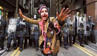 La policía advirtió que la acción de los activistas protestando por la cumbre “parece estar aumentando”. Antes de que comenzara el choque, ayer a la tarde, los transeúntes vieron divertidos cómo 500 anarquistas y miembros del Ejército de Payasos Rebeldes de Insurgentes Clandestinos hacían malabarismos con bolsas, golpeaban tambores y bailaban por los cordones policiales. Pero la tensión creció durante el “Carnaval para el Total Disfrute”, que había sido organizado para protestar contra la “guerra y el salario de esclavo”.