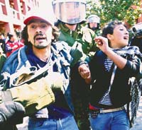 La violencia se concentró en las cercanías del cementerio, donde grupos anarquistas se enfrentaron con la policía. Grupos de manifestantes quemaron neumáticos y armaron barricadas interrumpiendo el tránsito y cortaron la electricidad dejando amplias áreas de la capital chilena sin luz. Un grupo de unas 500 personas destruyó un consultorio de salud en Lo Hermida, en un acto calificado de “barbaridad” por el presidente Ricardo Lagos. Carabineros reprimieron las manifestaciones con gases y chorros de agua. Un joven de 16 años, Cristian Castillo, que estaba junto a una fogata fue alcanzado por una bala en el corazón, disparada por la policía, según sus parientes. Hubo otros cuatro heridos a bala en distintos lugares, tres de ellos carabineros.