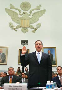 Brown, que fue relevado de su compromiso directo en las tareas de socorro por Katrina el 9 de septiembre antes de renunciar tres días más tarde, se ha convertido en el símbolo de la mala respuesta de la administración Bush al huracán, que mató a más de mil personas cuando golpeó en la costa del Golfo de Estados Unidos el 29 de agosto. Un ex funcionario de carreras de caballos, cuyas calificaciones principales para dirigir FEMA parecen haber sido su amistad con el director de campaña de la Casa Blanca del presidente George Bush en el 2000, es para los críticos de este último la corporización del amiguismo usado para llenar puestos vitales en el gobierno federal. Estos críticos están especialmente indignados porque, aun después de su desgracia, Brown todavía está trabajando para FEMA como asesor. Voceros de la agencia, sin embargo, dicen que este arreglo está por terminar y que a Brown le pagarán sólo un mes extra por “propósitos transicionales”.