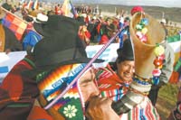 Detrás de los curtidos rostros cobrizos podía adivinarse la alegría de estar haciendo historia: “Salimos de nuestras comunidades a las 2 de la madrugada, otros que viven más lejos durmieron en las carpas, esto es muy importante para nosotros y para todo el pueblo boliviano. Evo Morales recibirá el bastón de mando para acabar con la discriminación, la pobreza y el desempleo”, decía uno de ellos en aymara dejando en evidencia que el apoyo al nuevo gobierno de izquierda no es un cheque en blanco. “Ya volvimos millones, en mi vida había visto algo así”, dice el mallku Luis Chávez en referencia a la frase “Volveré y seré millones” atribuida aquí al caudillo aymara Tupak Katari y no a Eva Perón. Al mediodía –cuando el frío y la lluvia abrieron paso a los intensos rayos del sol del Altiplano– la silueta de Morales apareció en uno de los cerros que rodea el templo Kalasasaya y donde se erigen los restos de la pirámide de Akapana. Entre proclamas de “Jallalla (viva) Evo” y “Jallalla Bolivia”, el líder aymara apareció vestido con una réplica del manto religioso andino (unku) que perteneció al período imperial tiahuanacota y que fue usado después de 10 siglos, con la ayuda de la tecnología digital que permitió recrearlo con alto grado de similitud con las prendas usadas en la época precolombina. Además, los sacerdotes indígenas “purificaron” al nuevo presidente indígena con agua de un manantial sagrado y de manos de cuatro amautas (sacerdotes indígenas) provenientes de Tiahuanacu, Charazani, Samaipata y el Chaco boliviano el líder cocalero recibió el báculo o bastón de mando indígena que le otorga el cargo de máxima autoridad entre los pueblos andinos.