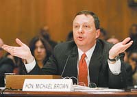 En su testimonio, Brown echó la mayor parte de la culpa por la torpe respuesta de la administración a un Departamento de Seguridad Interior “disfuncional”. Su obsesión con el terrorismo, dijo, había reducido la ayuda para desastres naturales al status de “hijastro” del Departamento, conformado a raíz de los ataques del 11 de septiembre.