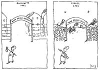 En una primera viñeta muestra a un judío a la entrada de Auschwitz bajo el lema “el trabajo lleva a la libertad”. En la segunda, el mismo judío se ha transformado en vigilante de la alambrada que cerca a los palestinos y el lema ha pasado a ser “la guerra lleva a la paz”. “En línea con la publicación de las caricaturas blasfemas en varios periódicos europeos, Hamshahri va a medir la santidad de la libertad de expresión entre los occidentales”, reta el anuncio publicado en la página 31 del diario. Las bases también pueden consultarse en la web del diario, en farsi y en inglés (http://www.hamshahri.org/images/InternationalCartoonE.jpg).